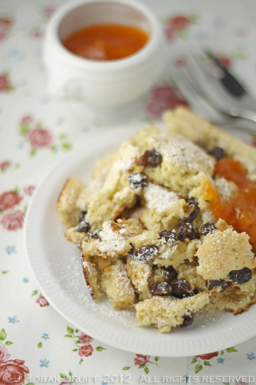 - Turn out onto a plate, tear apart with 2 forks, sprinkle with sifted icing sugar to serve. Serve with preserves of your choice – apple puree is traditional, but I love serving it with chunky apricot jam.