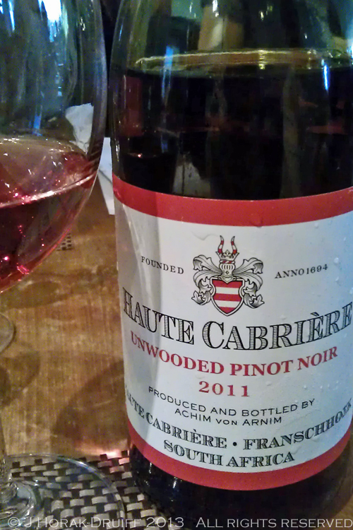 The meal was vintage High Timber – classic South African with a twist – and started off with mock snoek paté (snoek being hugely popular game fish in South Africa but extremely hard to obtain in the UK – angelfish makes good substitute). The smoked fish pate was pretty full-flavoured so from the selection of wines doing the rounds along the table, I chose to match it with two Chardonnays, the first being a 2010 Warwick Chardonnay (£14.99) – a wonderfully rich buttery wine, but balanced by a crisp citrus acidity, and a fabulous partner with food. The second wine was a 2011 Lourensford Winemakers Selection Chardonnay(£11.99), packed with rich apricot flavours, honeyed notes and a lovely creamy mouthfeel with a medium finish. This was my favourite white of the day. As I was on whites, I also sampled the 2012 Altydgedacht Ralph ParkerSauvignon Blanc (£11.00) – this was a revelation, packed with the flavours of ripe white peaches rather than the more austere, grassy Sauvignon Blancs that I am used to. The next course was a biltong and oxtail terrine served with blatjang, the Afrikaans word for chutney. And doing the rounds on the table was a curiosity – a 2011 Haute Cabriere unwooded Pinot Noir (£10.99). The colour was pale, even by Pinot Noir standards and seemed to suggest a rosé. On the palate it was light and lacking in substance – an interesting experiment, but it might just be than Pinot Noir needs wood!