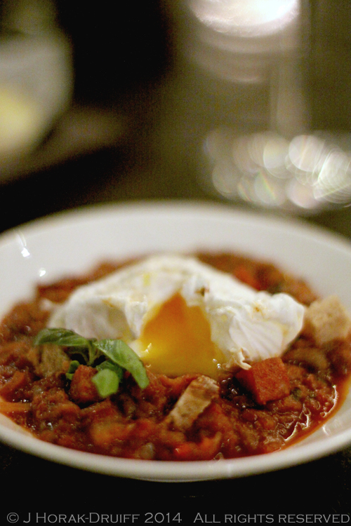 To tie in with the exhibition, the hotel’s restaurant and bar, The Balcon (now Wild Honey), has also created a number of special culinary dishes and cocktails using vegetables, and it was this menu that I was there to sample. I have visited The Balcon before but always forget what a lovely room it is, with its wall-mounted chandeliers and high ceilings. Once we were settled into our corner table, the super-friendly waiters brought over the menu and explained which dishes were created for the exhibition. Determined to try all of them, my companion Ailbhe started with the sweet pea sliders in cornbread madeleines with shallot jam and mint sauce (£5,00) while I chose the braised eggs with spicy chorizo,smoked aubergine and tomato cocotte (£5,00). Not only did the sliders make a very pretty starter, they were also ridiculously delicious – the peas had been made into little falafels sandwiched between the halves of the cornbread madeleines, and the combined effect of the coriander-spiced falafel, the crunchy madeleine and the sweet jam was just heavenly. We both agreed that my generous bowl of tomato cocotte topped with a perfect runny-yolked egg would make the world’s best breakfast – it’s lightly spiced and as comforting as a hug in a bowl, spiked with cubes of chorizo.
