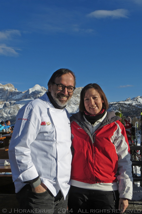 By now we were racing the clock to get to the remaining huts and so we skiied over to Ütia Ciampai where one Michelin-starred chef Cristina Bowerman of Hosteria Glass in Rome presented us with a dish of slow-cooked pork cheek, Puccia (crunchy rye bread), sauerkraut, South Tyrolean apple and pine nuts. This was paired with the only red wine of the day – and Alto Adige Schiava / Südtirol Vernatsch. I was not familiar with the Schiava grape, but it makes a fairly light-bodied red with luscious strawberry fruit and an underlying smoky note. It was a great match with the pork cheek and even worked pretty well with the sauerkraut. We loved sitting on the terrace in the perfect late-afternoon weather finishing our wine and watching the skiiers whizz past.