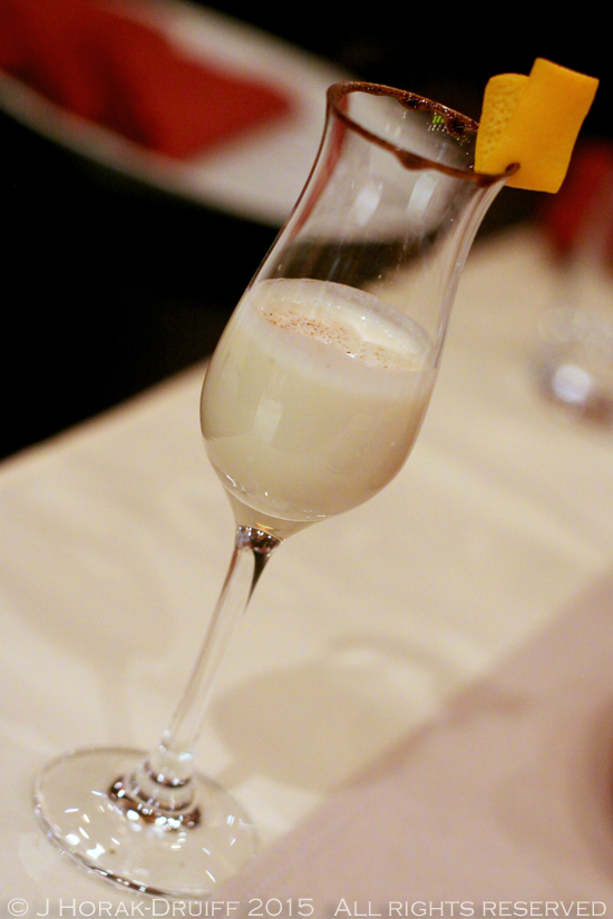 Having reached the end of the savoury courses, our final two courses were desserts. First up was a deliciously light one: a little bowl of chamomile velvet panna cotta topped with a lemon balm sauce (£1.42). This was soothing, creamy and mercifully neither too rich nor sweet, and we loved the pale green colour of the lemon balm sauce. The other dessert was a little more decadent. Called “Jaffa rendezvous”, it sought roughly to recreate the flavours of a Jaffa cake – but in a Kilner jar. The base consisted of crispy ground hazelnuts, topped with a feather-light chocolate and orange cream and finally an orange, Amaretto and cinnamon gel. I loved all the elements of this – the textures as well as the chocolate-orange flavours – and particularly the mousse, which I would guess from its texture contained only eggs and chocolate, just like my mom used to make (£1.72). And of course, we could not be allowed to leave without a little digestif!