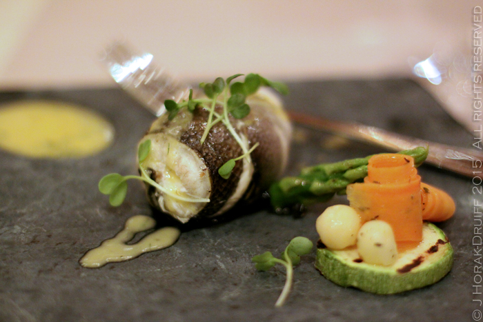 After two relatively rich dishes, the next two were lighter. First up was shrimp-filled seabass fillet with lemon and dill Hollandaise sauce and glazed vegetables (£9.41). This was beautifully plated and a wonderful dish for Spring, pairing crispy vegetables with a fish fillet neatly rolled around a filling of shrimps and dotted with good Hollandaise sauce. The following dish was another hot favourite around the table: duck breasts on sweet potato puree with asparagus; a Bermet (local dessert wine) and orange sauce; and a dot of cumin and chammomile emulsion (£10.00). The duck breasts had been cooked sous vide and retained a pink, juicy plumpness that is so hard to achieve with other cooking methods. The asparagus remained pleasantly al dente, and the sweet potato and the orange sauce provided a good foil for the slightly spicy duck meat.