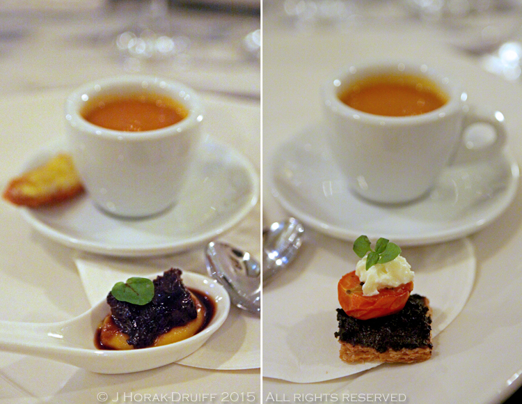 From there we crossed the road over to Berry Brothers & Rudd – sadly closed by that time, but still a treat to peer through the windows of this historic wine merchant with its sloping wooden floors. The shop started life as a grocer in 1698 and soon thereafter started supplying coffee to London’s wealthy, hence the outsize vintage scales in the shop (used to weigh bags of coffee and later, customers!) and the emblem of the coffee grinder which the company still uses. The business was passed down through various generations of the family and in-laws and finally became more of a wine and spirits merchant in the 1800s, pioneering things such as climate-controlled cellars and online wine sales. They have also picked up two Royal Warrants (supplying wine and spirits to the Queen and Prince Charles) along the way. We then stepped into the small alleyway next door which opens out into Pickering Place, allegedly the site of London’s final public duel and also London’s smallest public square. It’s also from here that you can slip into Boulestin via their courtyard seating. Boulestin was named after culinary pioneer Marcel Boulestin, a pre WW2 culinary pioneer who published a1923 cookbook Simple French Cooking for English Homes; was the first chef to appear on British television in 1937; and a huge influence on food writer Elizabeth David. It’s the brainchild of restauranteur Joel Kissin who cut his teeth in the Conran group and clearly knows his stuff. Perfectly on trend as far as the current longing for nostalgic foods is concerned, the restaurant offers unashamedly classic French all-day dining and we were offered a small sample of that’s available. First up was a little crostini of olive jam and cherry tomato; followed by a blindingly good soupe de poisson and a cheesy crouton; and a morsel of daube of beef on marrow and squash puree. To finish with something sweet, we had a decadent little cup of Sauternes custard with Agen prune and, fittingly, washed it all down with Berry Brothers’ Good Ordinary Claret.