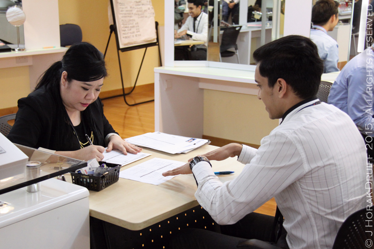 So having seen how Singapore Airlines meals are prepared and packaged, after lunch it was time to take a closer look at how the crew who serve these meals and fly the plane are trained. A short car journey from SATS brings you to the Singapore Airline Training Centre (SATC), the hub from where all the airline’s flight crew, cabin crew and administrative/management personnel are trained. In addition to management development ant IT training, this is also a fully-equipped flight school including eight flight simulators including pretty much every model of aircraft in the airline’s fleet. Pilots not only have to learn to fly but they also have to do a full course of study to convert from flying from one type of aircraft to another, and they need to spend a certain number of hours on the flight simulators every few months to practise emergency procedures and to maintain their technical skills. Sadly, we could not see the simulators on the day we were visiting as they were all full – but next time! Cabin crew have their own training programme – 15 rigorous weeks during which they learn about service etiquette; safety procedures and announcements; food and wine appreciation; and advanced grooming. We were fortunate to be able to sit on on one of the grooming classes where a group of young men and women were being put through their paces by their humorous but firm trainer, herself a former cabin attendant. There is a lot of legacy behind the image of the Singapore Airlines cabin crew – the Singapore Girl became a marketing icon for the airline in the early seventies as the epitome of elegance, charm and service excellence. Today, strict grooming rules ensure that cabin crew adhere to the same high standards. Female cabin crew members are individually assessed and assigned a colour palette of eye and lip colours – with nails to match lips; and all crew members have to adhere to hairstyle requirements. For men, this means that hair may not touch the ears, collar or eyebrows; and for women, there are five approved hair styles (bun, French plait, French roll, bob and pixie cut). This may sound petty, but it promotes a uniformly elegant corporate image as well as minimising the chances of stray hairs in food.