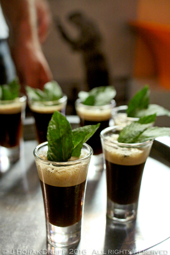 For dessert, chef Idoia gave us poached white peaches with ‘pistachio crème Anglaise’ containing a hint of refreshing rosemary. This was accompanied by another inspired and unusual wine choice from Keith: a late harvest, botrytised Sauvignon Blanc ‘Moelleux’ from John & Mike Favre with a hint of peaches to complement our dessert. And instead of coffee we finished with gorgeous little espresso cocktails using artisan Moon Roast coffee and 49% Sonoma County Rye Whisky from pot stills, aged in American oak barrels – a delightfully grown-up end to the meal.