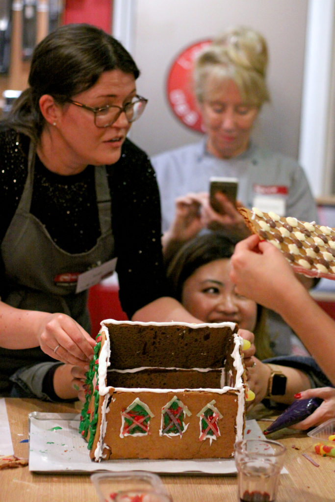 A mere 15 minutes later our gingerbread walls and roof slabs were baked and ready to come out of the oven (setting the NEFF oven’s timer for this was a lifesaver!) and ready to have their windows and doors cut out before the dough hardened. While this was carrying on, the brilliantly funny and sweary Dani and I set about making the royal icing that would hold the structure together ultimately. Again, this is really simple – egg whites, icing sugar and lemon juice (and food colouring so you can get creative!) . My only advice would be to make sure that the egg whites really do whip into stiff peaks because otherwise your house will not hold together – it’s like having watery cement. With the gingerbread slabs nows hard enough, our team could start the delicate task of assembling the house. Lesson learnt? THIS IS HARDER THAN IT LOOKS!! The secret is many hands to steady walls; and icing that is robust enough to act as glue. And nerves of steel, obviously!