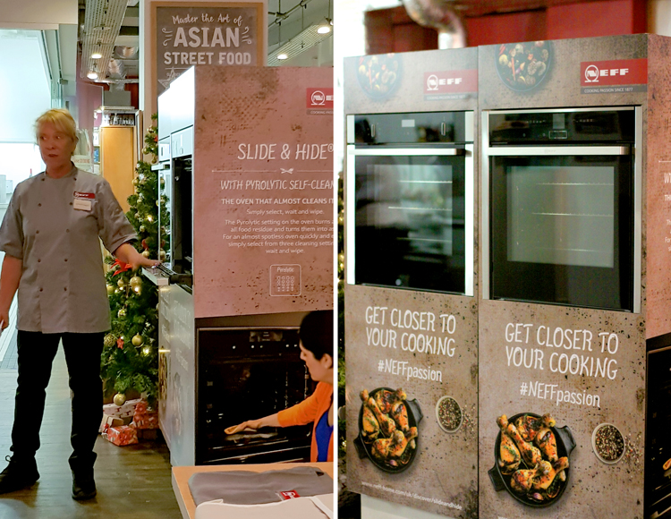 The evening took place at L’atelier des Chefs in Foster Lane and kicked off with mulled wine, Champagne and cheese before a short demo of the ovens. NEFF Slide & Hide® ovens are the only ovens currently on the market featuring a door that fully opens and then magically slides away under the oven, ensuring easier accessibility to the oven cavity (and more proximity to the food you are cooking) and most importantly for people like me with, shall we say, bijoux kitchens – it provides more space in the kitchen. It’s also an important safety feature for those with small children and inquisitive pets – no accidentally putting a hand or a paw on the interior surface of a hot oven door. But apart from this nifty feature, the ovens also feature a range of other options, including pyrolytic self-cleaning (a cleaning cycle where the oven burns away fatty deposits at the touch of a button and requires only a wipe from you – because I LOVE scrubbing my oven, said nobody, ever!); VarioSteam® which adds three different levels of steam intensity to ensure perfect results from roasting, baking or warming up dishes; and CircoTherm®, a unique hot air system for even heat distribution and simultaneous baking and roasting on up to 3 levels without the flavours of the dishes mingling.
